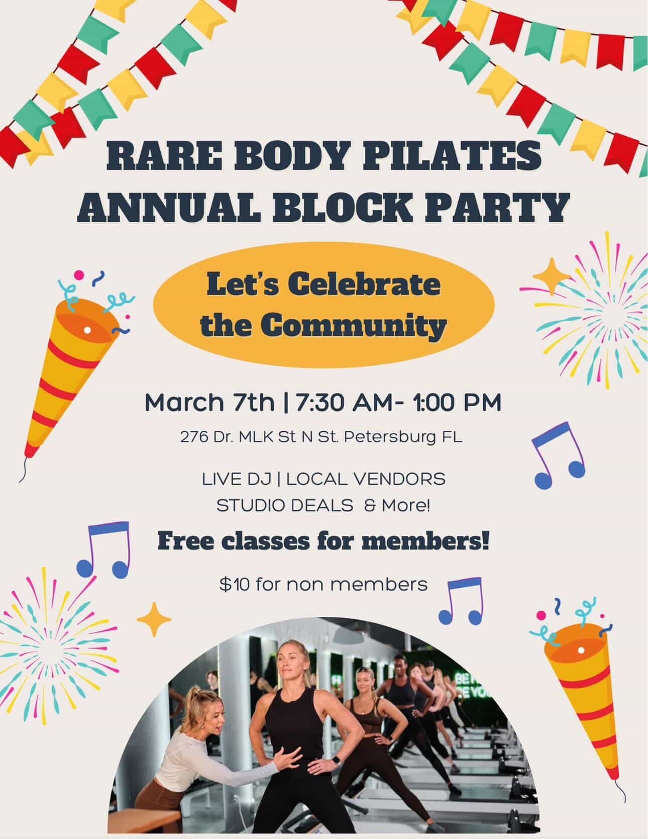 Join us March 7th from 7:30 AM – 1:00 PM at Rare Body Pilates in St. Pete as we celebrate community, movement, and local businesses!